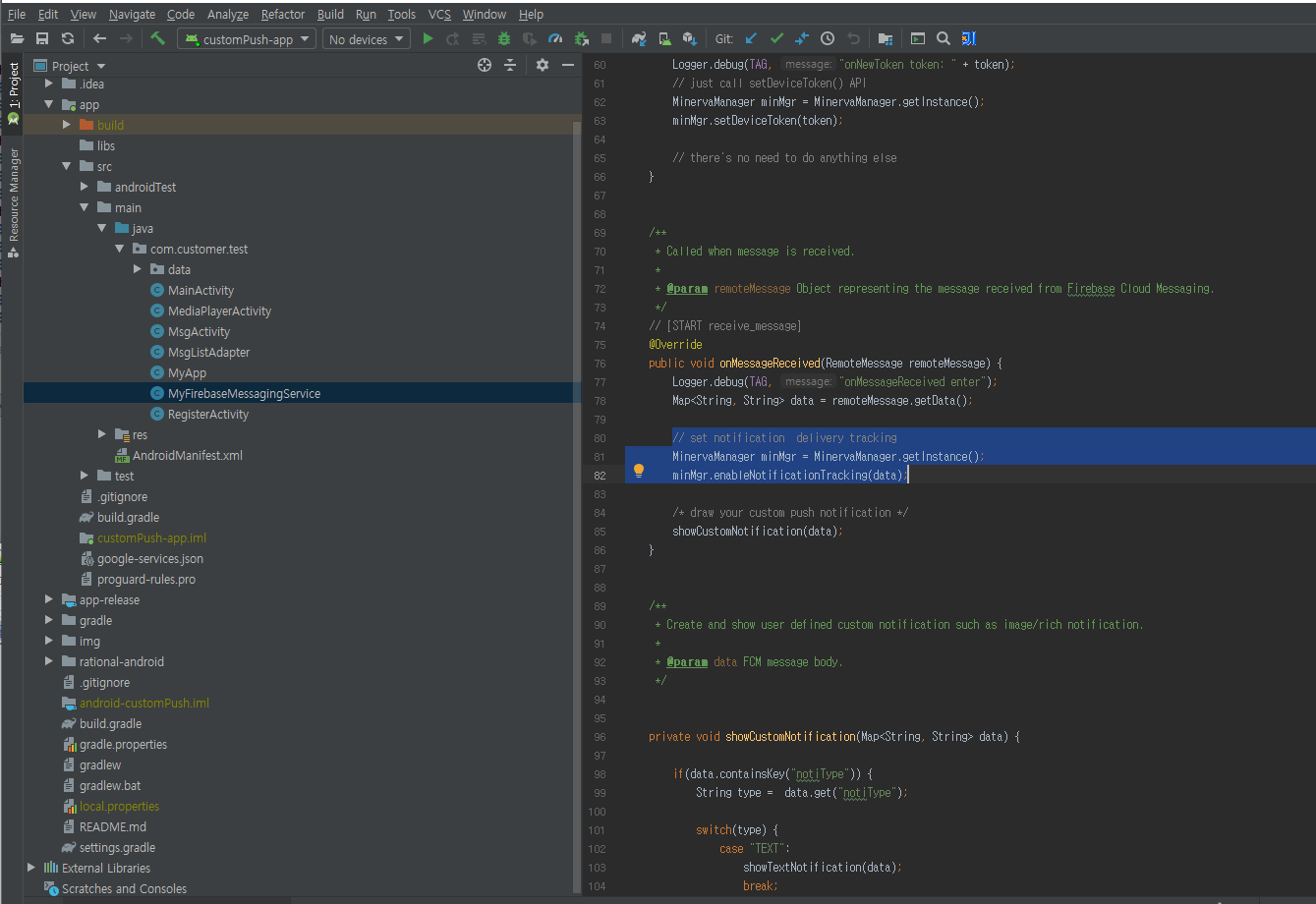 1. FirebaseMessagingService의 onMessageReceived 콜백 내에 enableNotificationTracking() API를 호출한다.