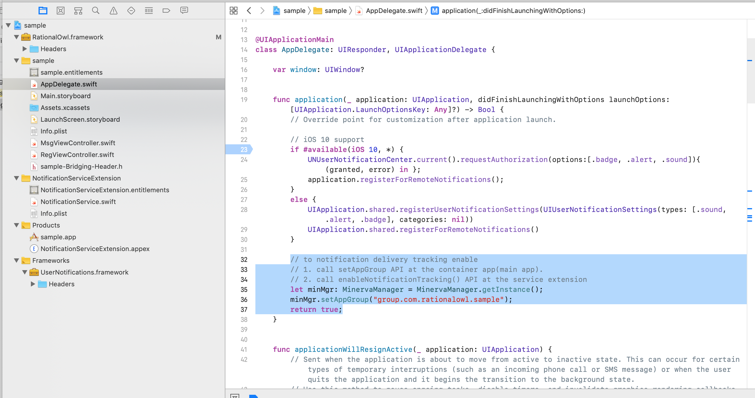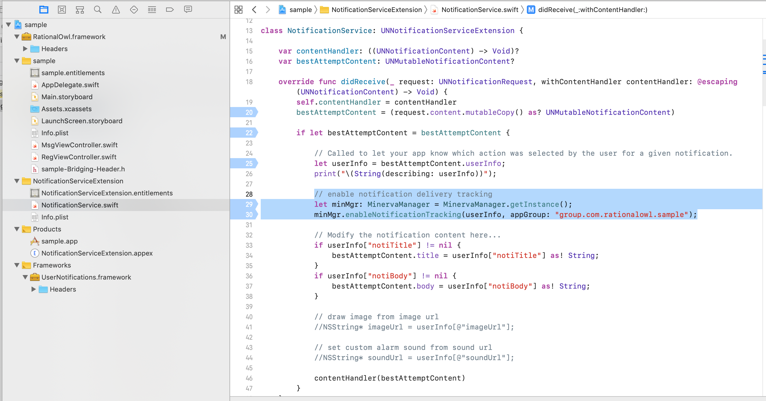 minMgr.enableNotificationTracking(userInfo, appGroup: "group.com.rationalowl.sample");