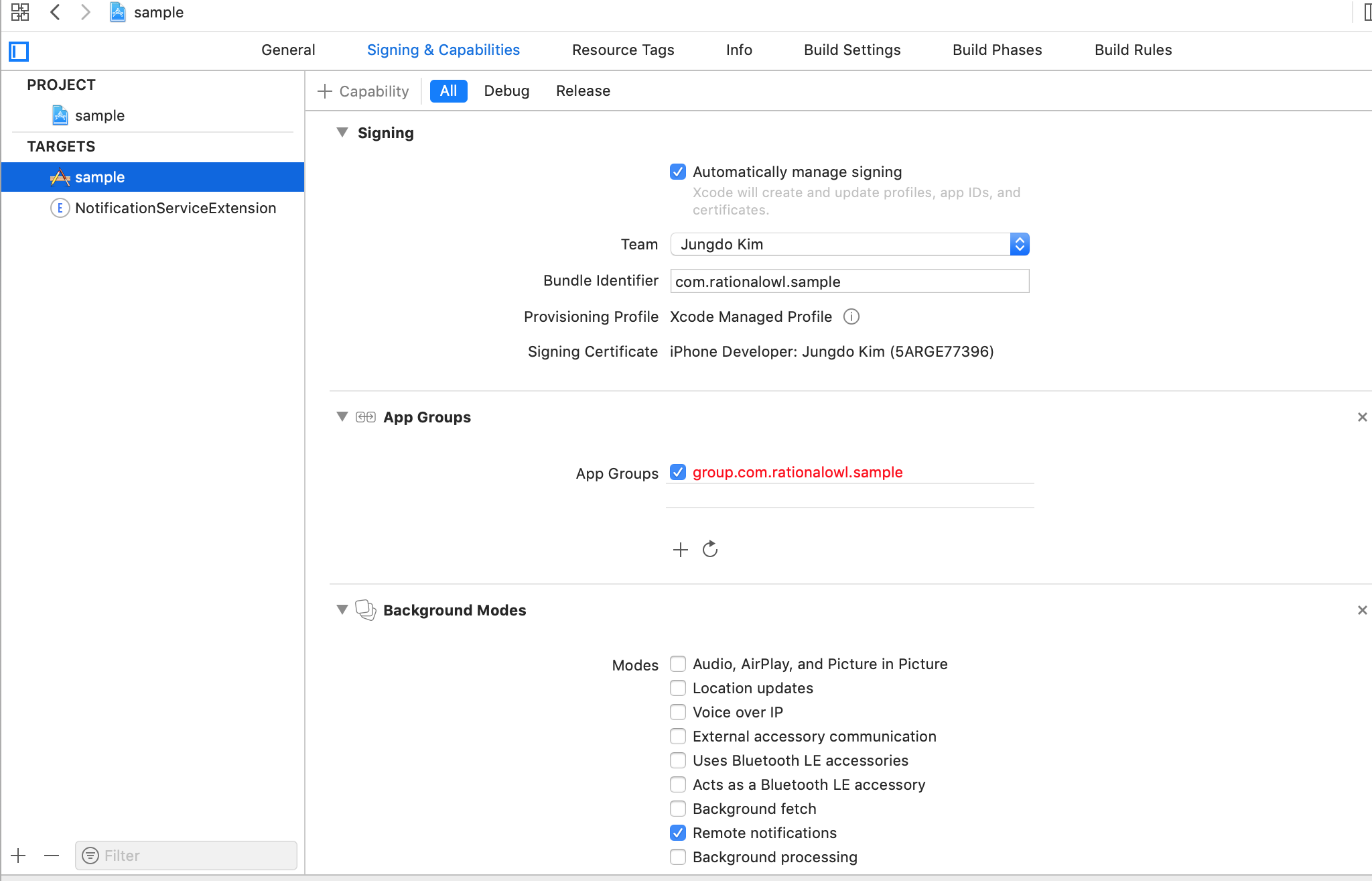 IOS 단말앱에서 알림전달 트래킹을 지원하기 위해서 IOS 앱과 Service Extension 간 동일한 앱그룹 지정이 필요하다. IOS 샘플앱을 기준으로 해당 과정에 대해서 설명한다.